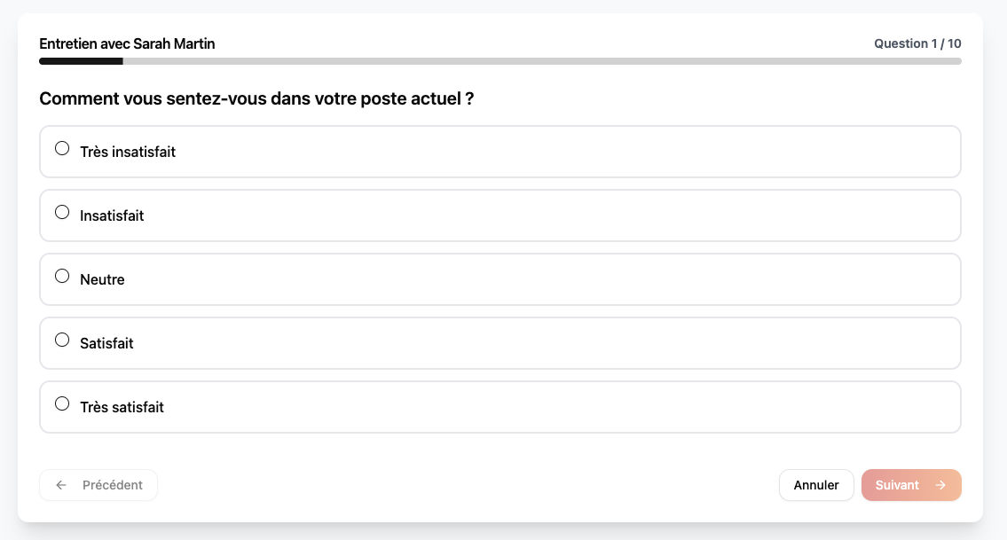 Le collaborateur repond aux questions structurees couvrant motivation, competences, relations d'equipe, conditions de travail et communication.