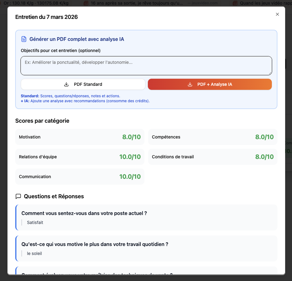 Chaque entretien genere un document PDF complet et professionnel que vous pouvez archiver, imprimer ou partager. Le PDF inclut les reponses du collaborateur, les scores par categorie, l'analyse IA avec ses recommandations et le plan d'action defini.
