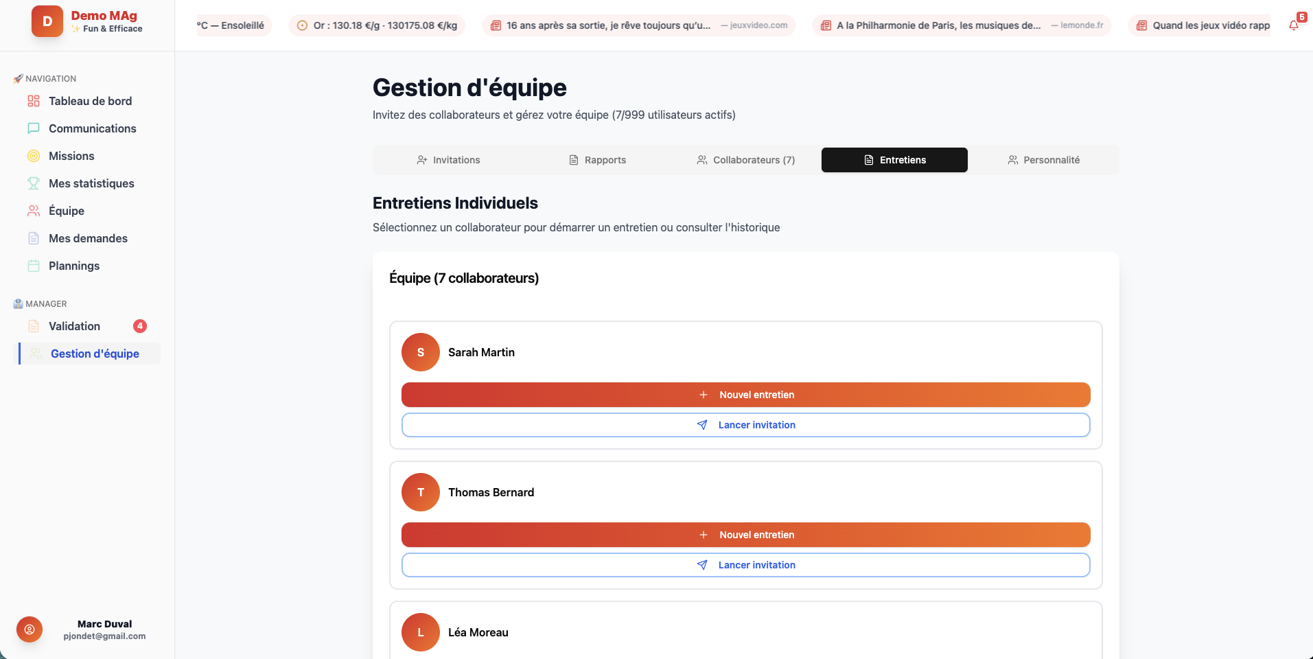 L'analyse IA tient egalement compte de l'historique des entretiens precedents pour identifier les evolutions positives ou les points de vigilance recurrents. C'est un veritable assistant intelligent qui aide le manager a prendre les bonnes decisions pour chaque membre de son equipe.